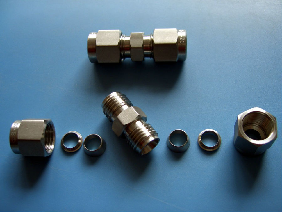 雙卡直通中間接頭由三部分組成:接頭體、卡套、螺母。當卡套和螺母套在鋼管上插入接頭體后,旋緊螺母時,卡套前端外側與接頭體錐面貼合,內刃均勻地咬入無縫鋼管,形成有效密封。卡套接頭具有連接牢靠、耐壓能力高、耐溫性,密封性和重復性好、安裝檢修方便、工作安全可靠等特點。